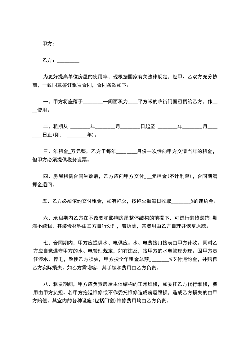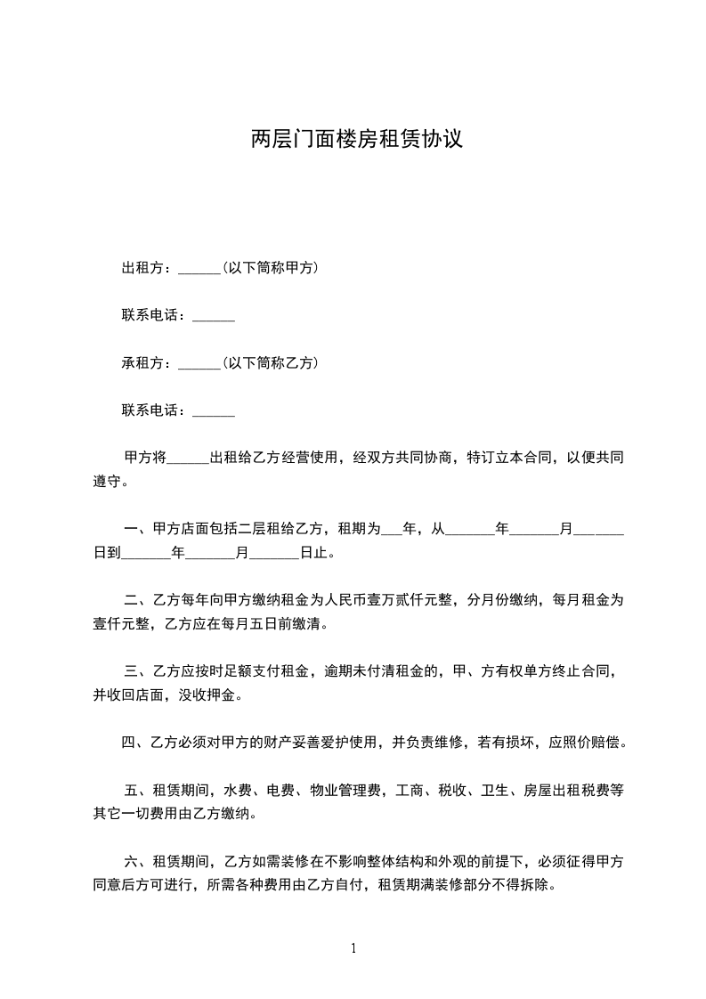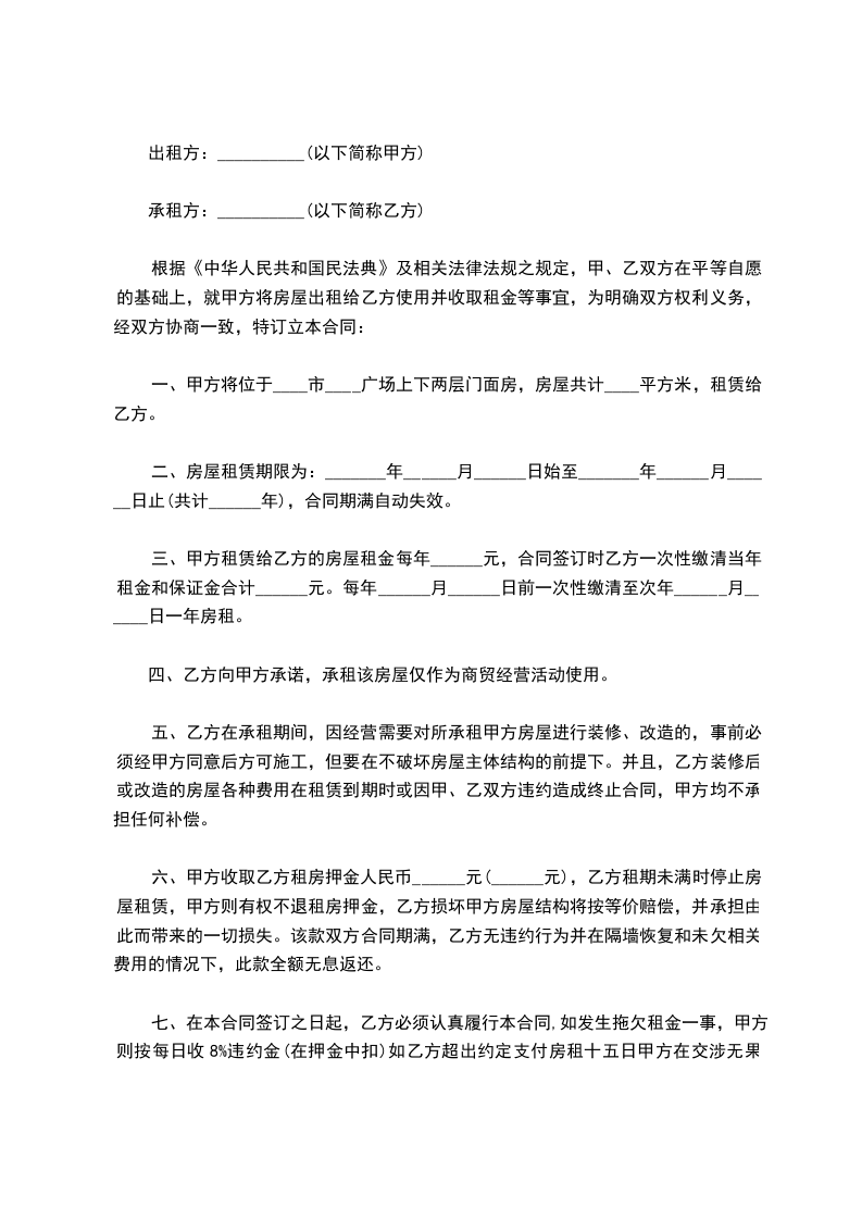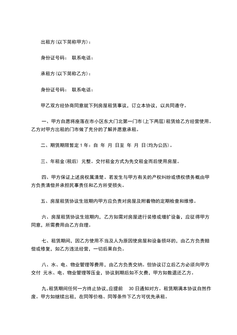 一、甲方自愿将座落在市小区东大门北第一门市(上下两层)租赁给乙方经营使用。乙方对甲方出租的门市做了充分的了解并愿意承租。
