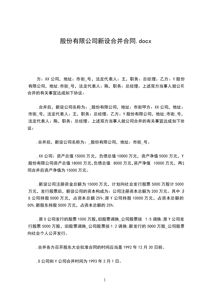 1.合并后,新设公司名称为:股份有限公司,地址: 市 街 号。