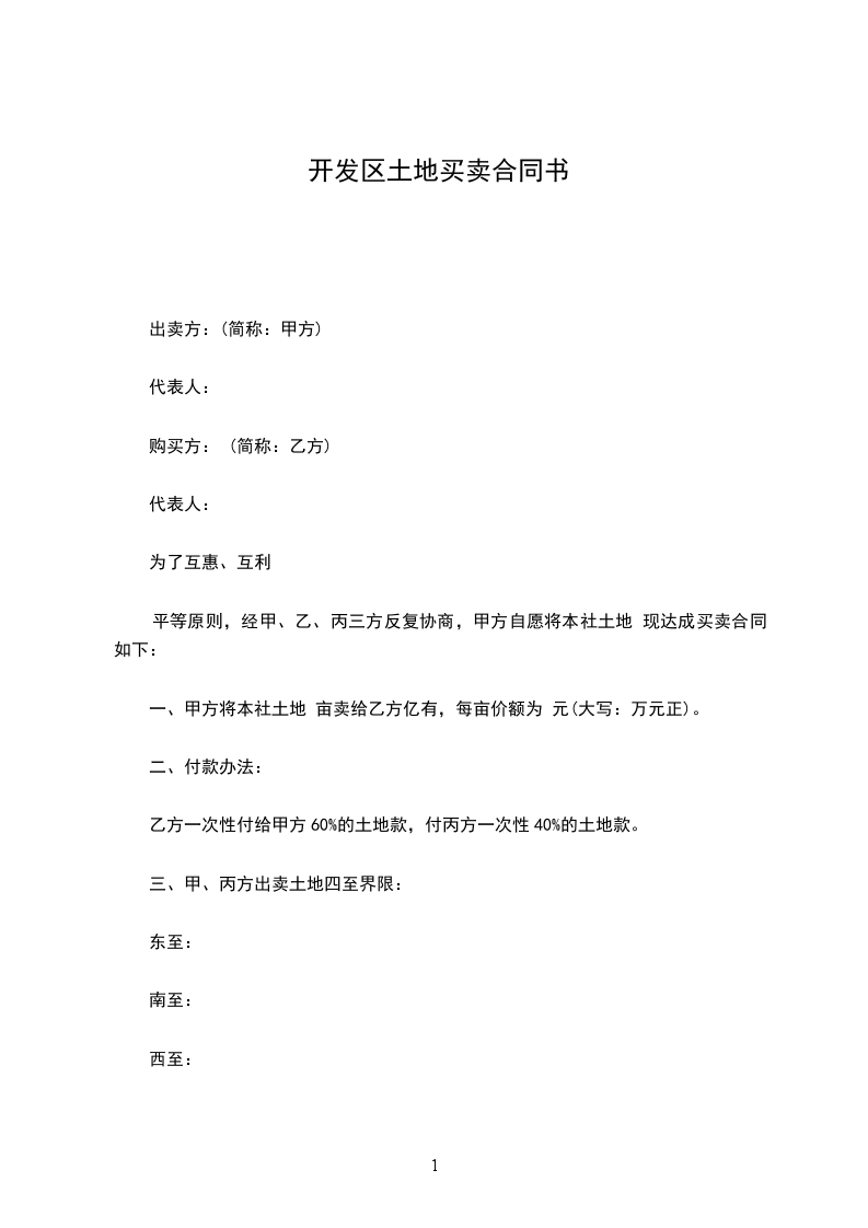 乙方一次性付给甲方60%的土地款,付丙方一次性40%的土地款。
