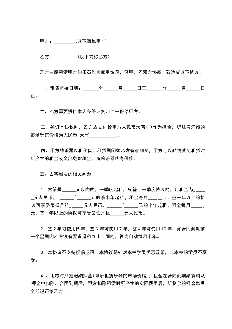 乙方自愿租赁甲方的乐器作为家用练习,经甲、乙双方协商一致达成以下协议: