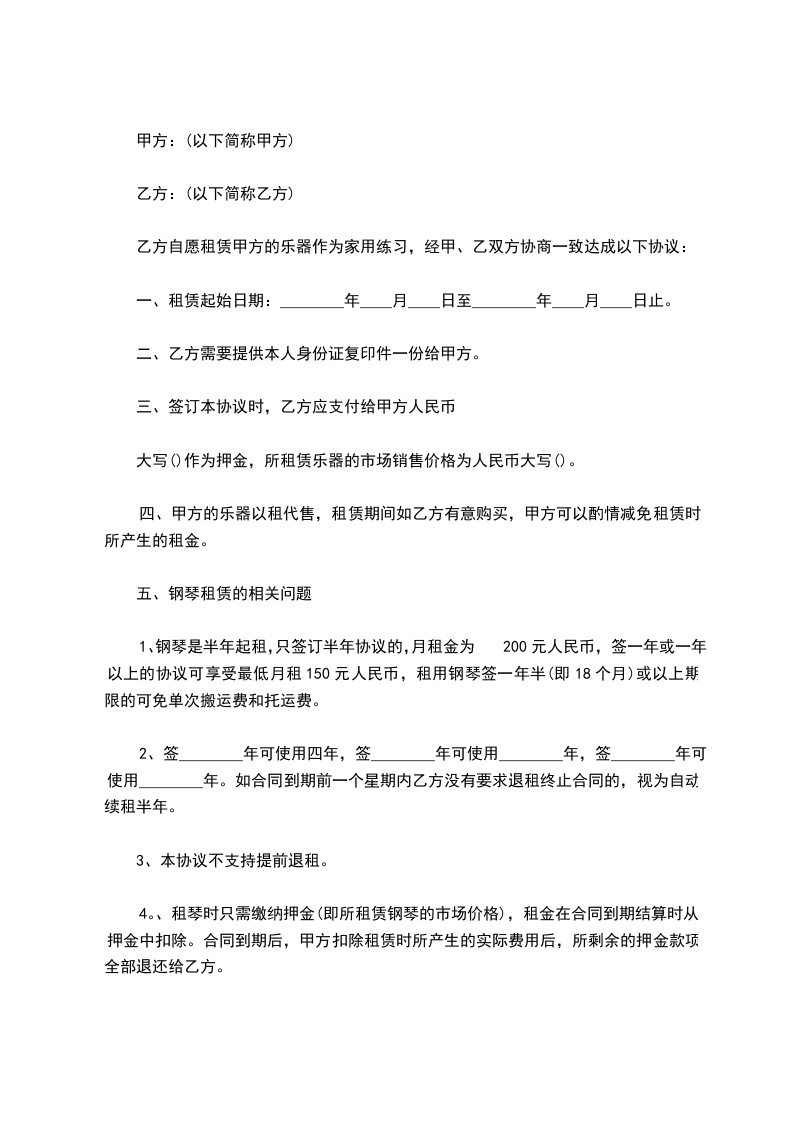 4。、租琴时只需缴纳押金(即所租赁钢琴的市场价格),租金在合同到期结算时从押金中扣除。合同到期后,甲方扣除租赁时所产生的实际费用后,所剩余的押金款项全部退还给乙方。