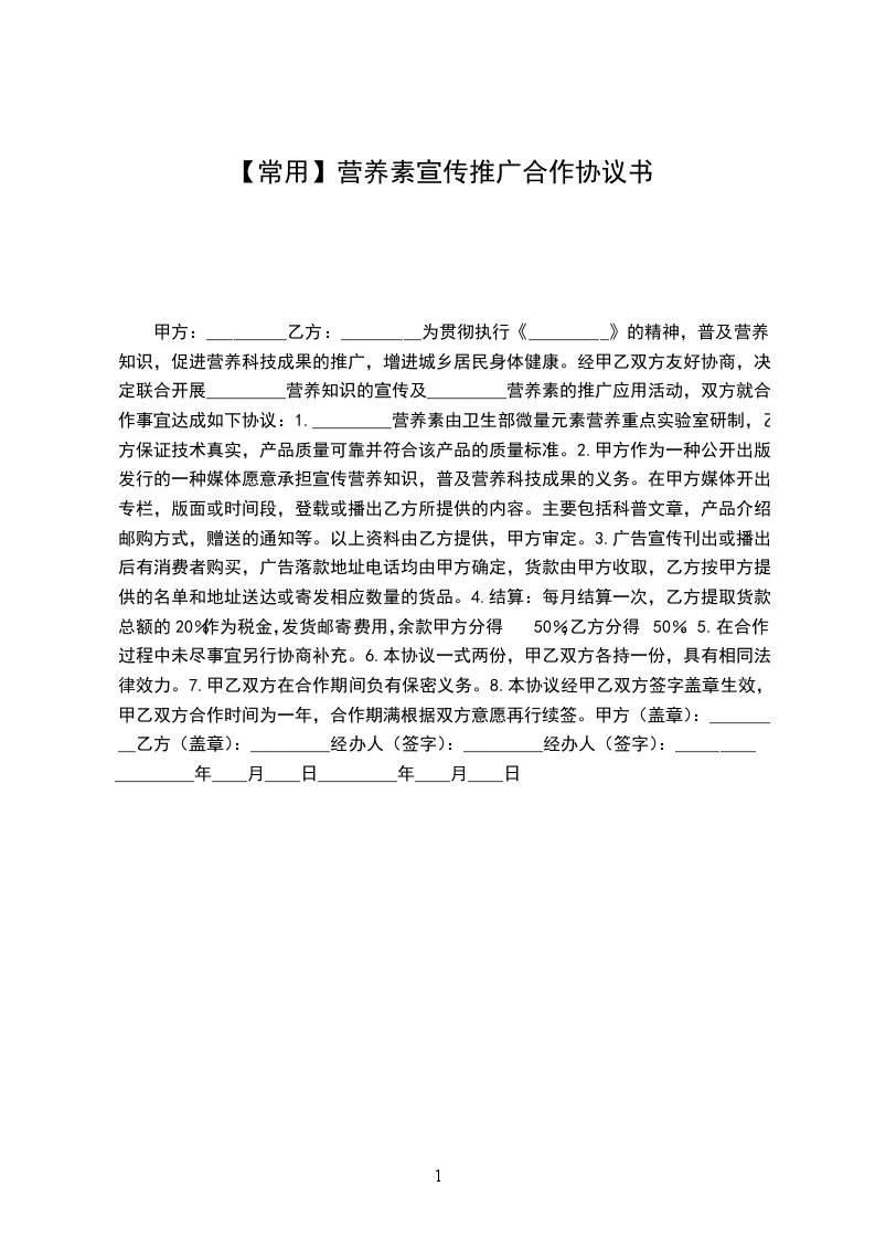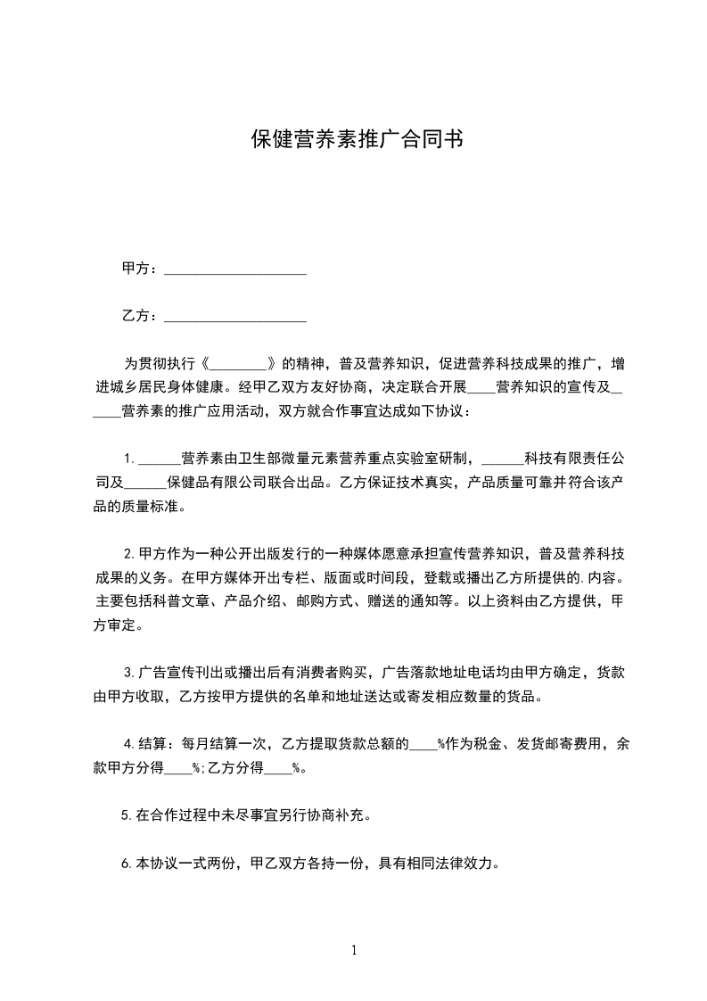 为贯彻执行《________》的精神,普及营养知识,促进营养科技成果的推广,增进城乡居民身体健康。经甲乙双方友好协商,决定联合开展____营养知识的宣传及______营养素的推广应用活动,双方就合作事宜达成如下协议: