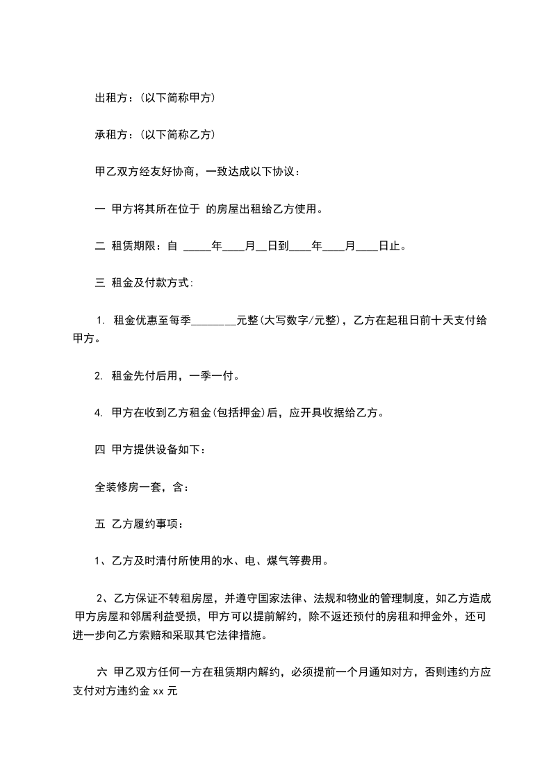 1. 租金优惠至每季________元整(大写数字/元整),乙方在起租日前十天支付给甲方。
