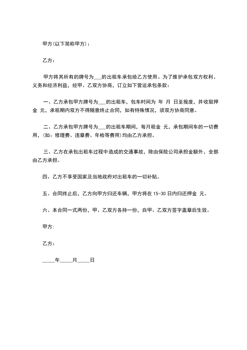 一、乙方承包甲方牌号为___的出租车,包车时间为 年 月 日至报废,并收取押金 元,承租期内双方不得随意终止合同,如有特殊情况,须双方协商同意。