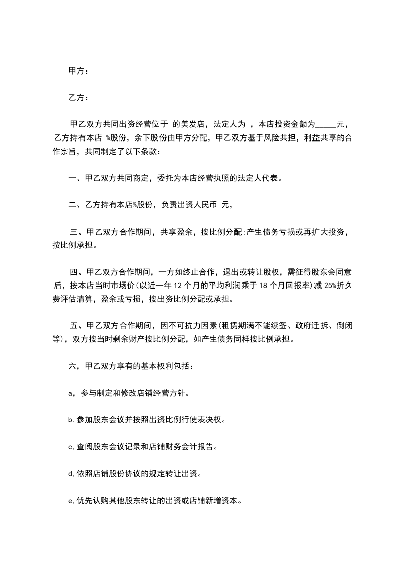 甲乙双方共同出资经营位于 的美发店,法定人为 ,本店投资金额为_____元,乙方持有本店 %股份,余下股份由甲方分配,甲乙双方基于风险共担,利益共享的合作宗旨,共同制定了以下条款: