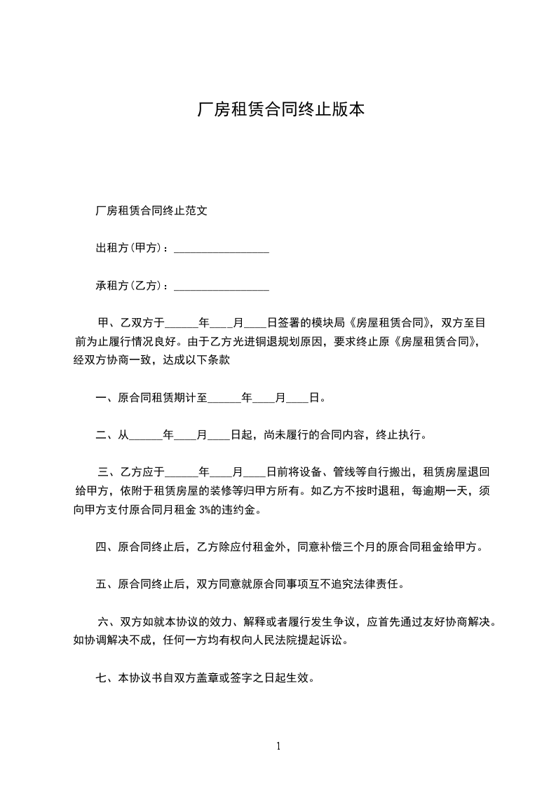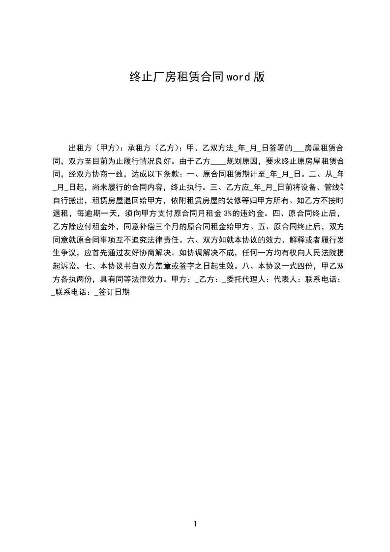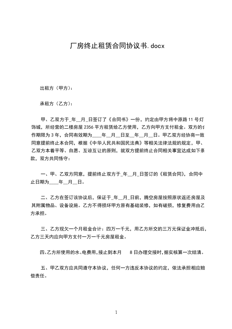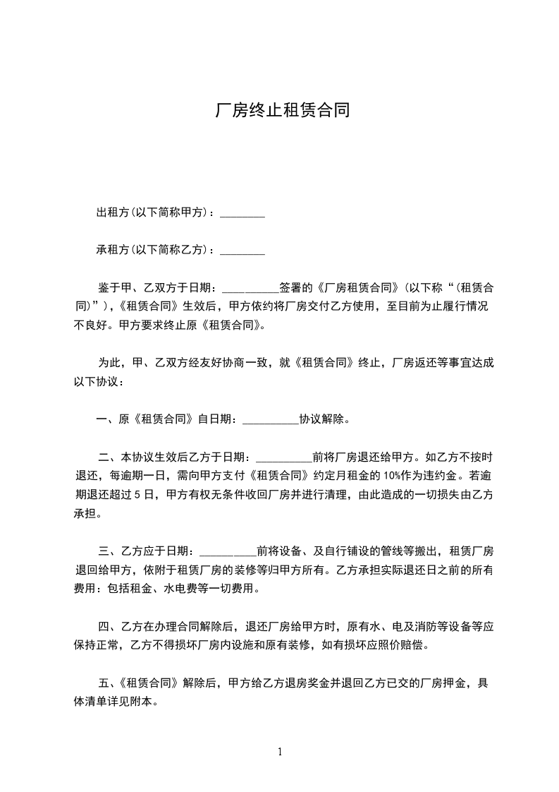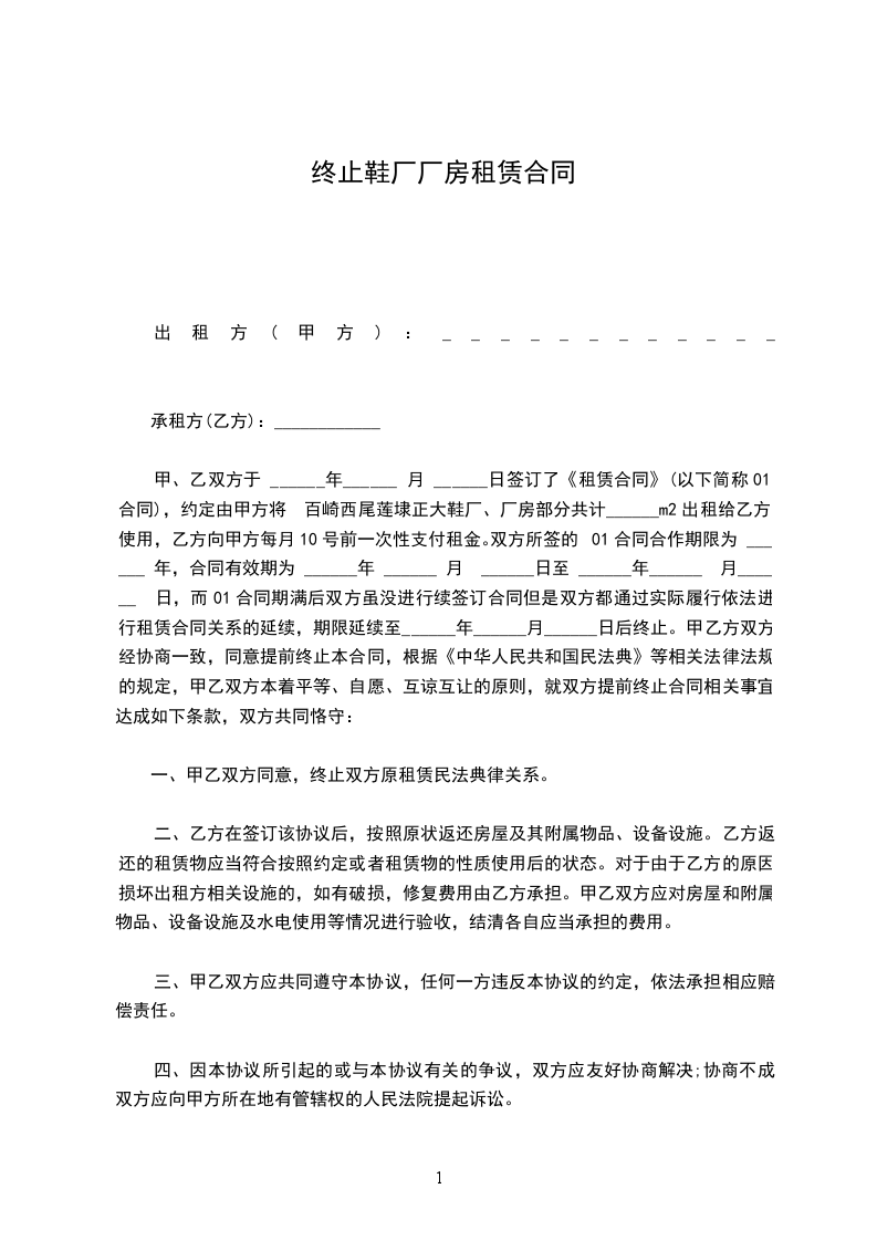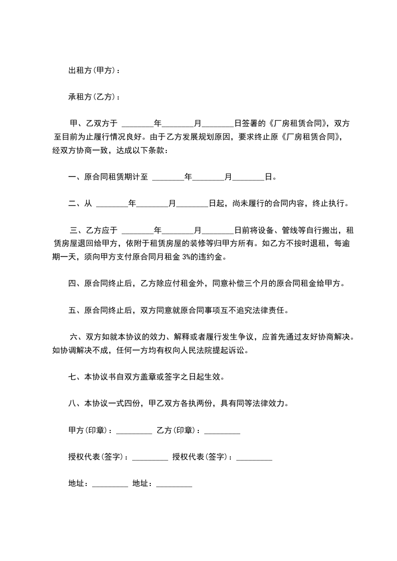 鉴于甲、乙双方于 年 月 日签署的《厂房租赁合同》(以下称“(租赁合同)”),《租赁合同》生效后,甲方依约将厂房交付乙方使用,至目前为止履行情况不良好。甲方要求终止原《租赁合同》。为此,甲、乙双方经友好协商一致,就《租赁合同》终止,厂房返还等事宜达成以下协议: