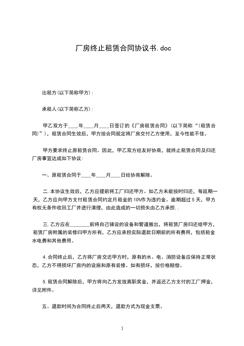二、本协议生效后乙方于 年 月 日前将厂房退还给甲方。如乙方不按时退还,每逾期一日,需向甲方支付《租赁合同》约定月租金的10%作为违约金。若逾期退还超过5日,甲方有权无条件收回厂房并进行清理,由此造成的一切损失由乙方承担。