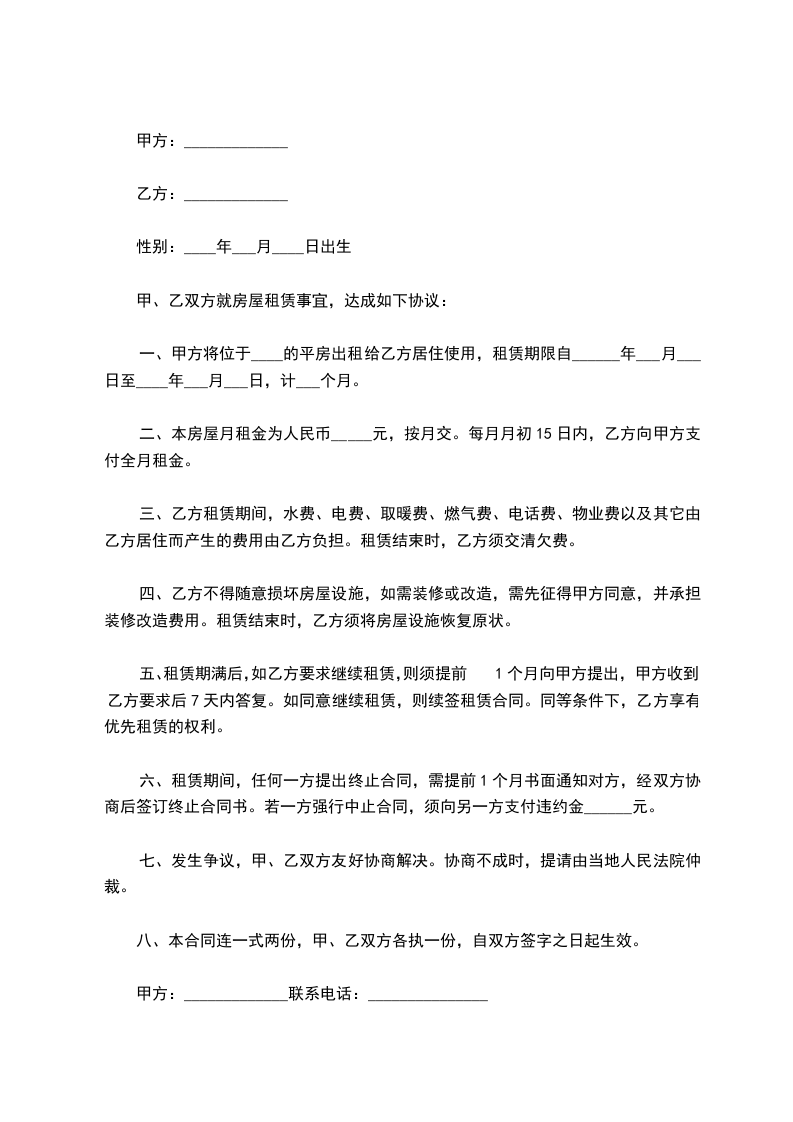 一、甲方将位于____的平房出租给乙方居住使用,租赁期限自______年___月___日至____年___月___日,计___个月。