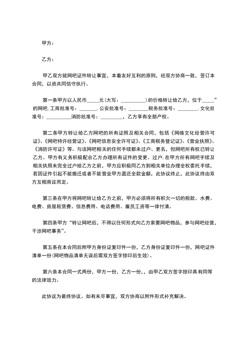 第一条甲方以人民币_____元(大写:__________)的价格转让给乙方,位于_____”的网吧,工商批准号:_______,公安批准号:________税务批准号:________,文化批准号:__________消防批准号:_________,乙方享有全部产权。