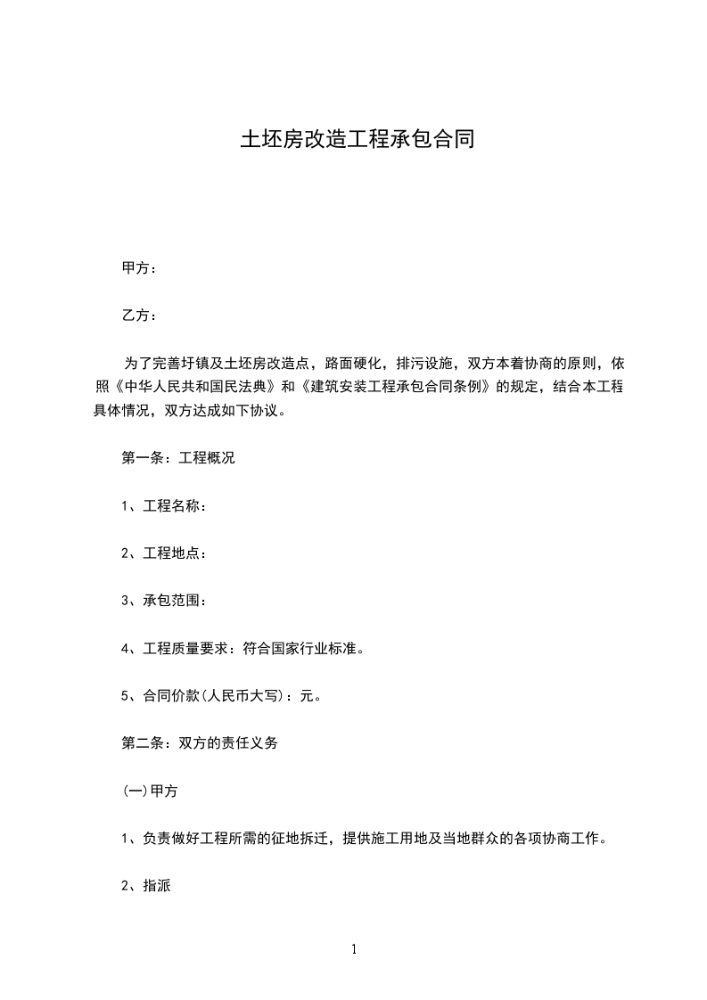 为了完善圩镇及土坯房改造点,路面硬化,排污设施,双方本着协商的原则,依照《中华人民共和国民法典》和《建筑安装工程承包合同条例》的规定,结合本工程具体情况,双方达成如下协议。