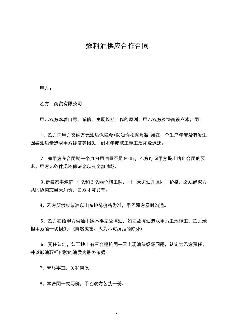 1、乙方向甲方交纳万元油质保障金(以油价收据为准)如在一个生产年度没有发生因柴油质量造成甲方经济等损失,到本年度施工停工后如数退还。