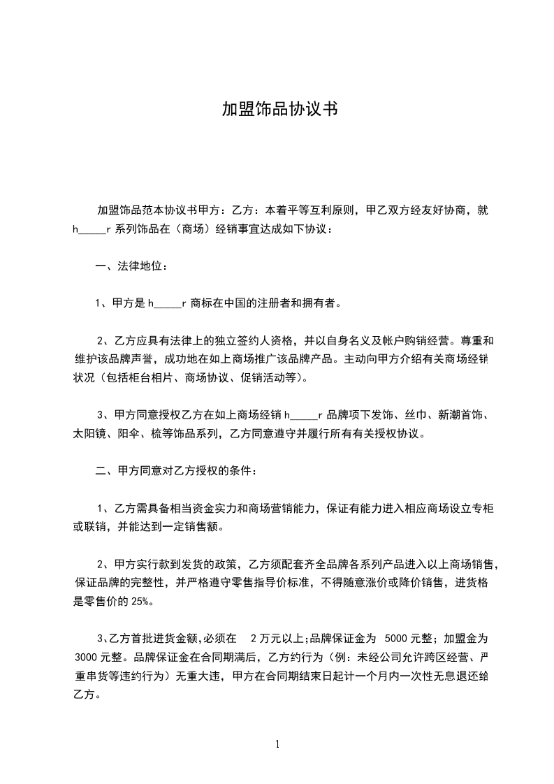 3、 甲方同意授权乙方在如上商场经销“Herlenar”品牌项下发饰、丝巾、新潮首饰、太阳镜、阳伞、梳等饰品系列,乙方同意遵守并履行所有有关授权协议。