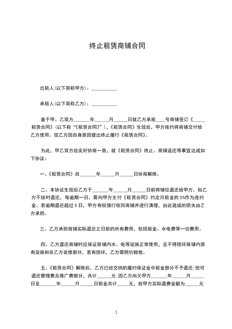 双方协商达成一致同意于________年____月____日提前终止商铺的租赁合同。根据合同的条款约定,经双方友好协商,就终止该租赁合同事宜达成以下协议: