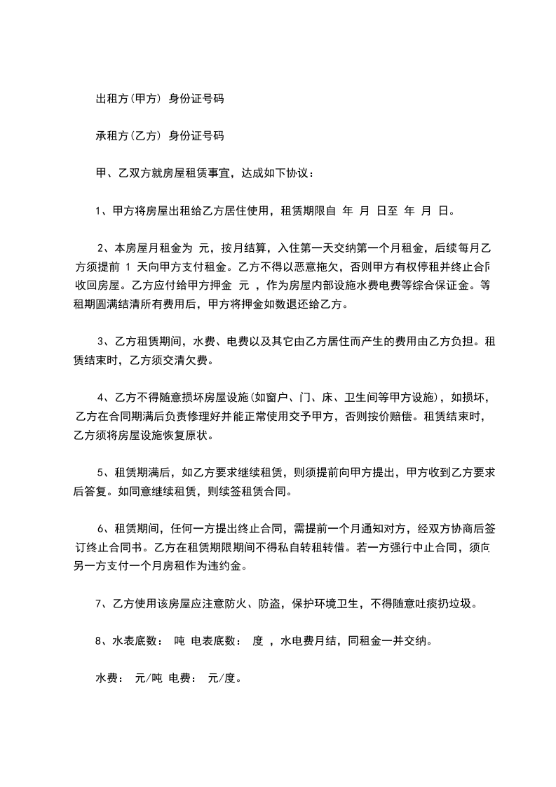 6、租赁期间,任何一方提出终止合同,需提前一个月通知对方,经双方协商后签订终止合同书。乙方在租赁期限期间不得私自转租转借。若一方强行中止合同,须向另一方支付一个月房租作为违约金。