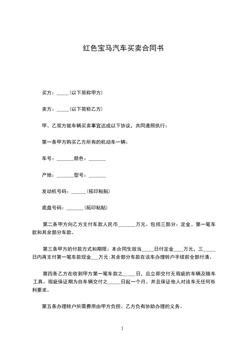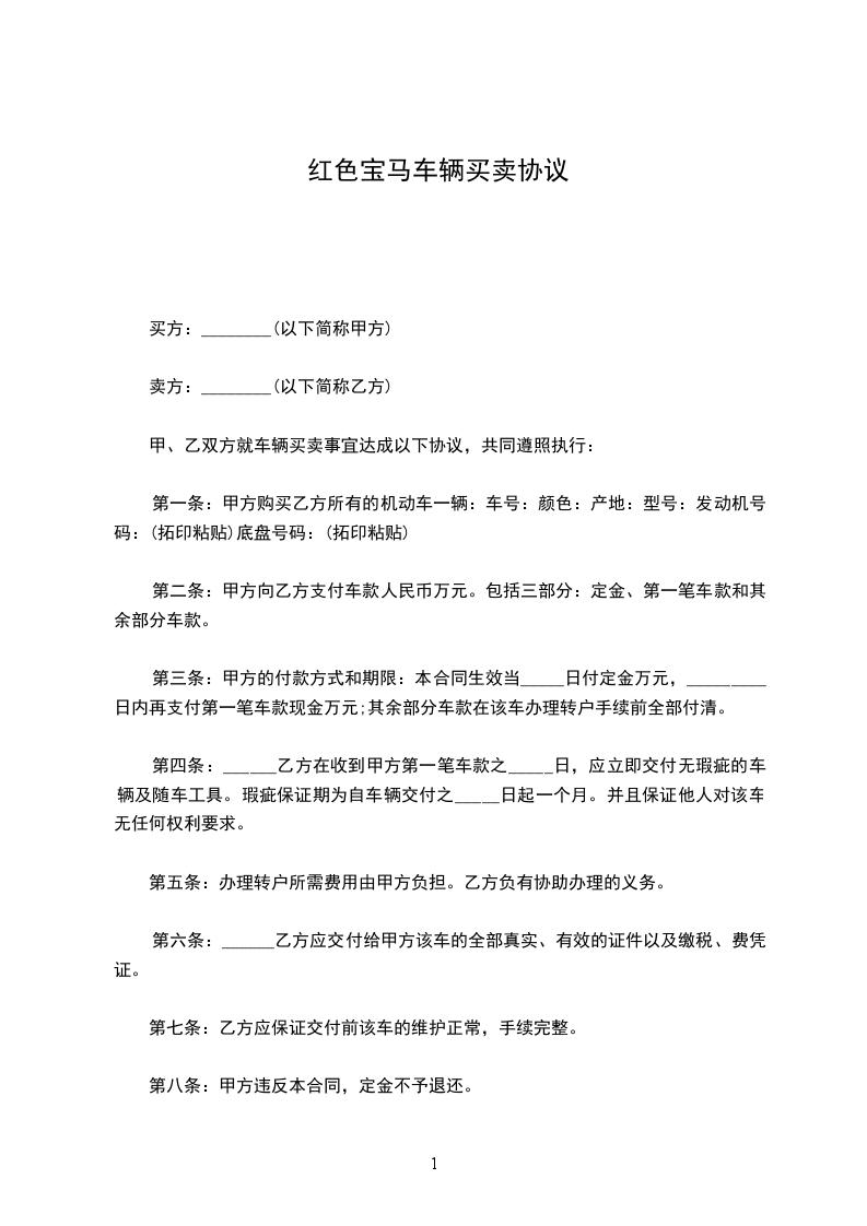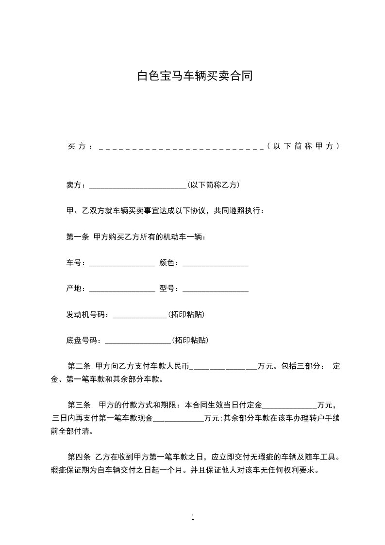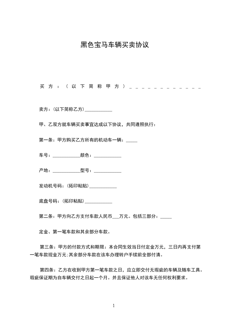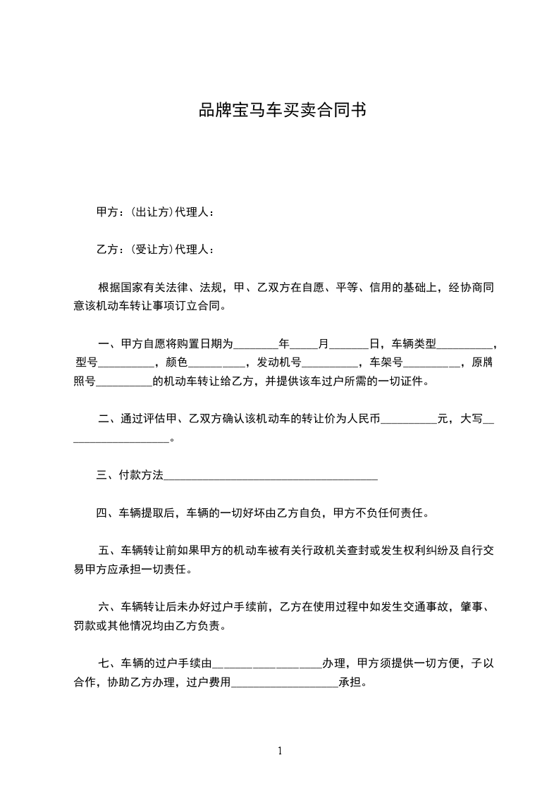 一、甲方自愿将购置日期为________年_____月_______日,车辆类型__________,型号__________,颜色__________,发动机号__________,车架号__________,原牌照号__________的机动车转让给乙方,并提供该车过户所需的一切证件。