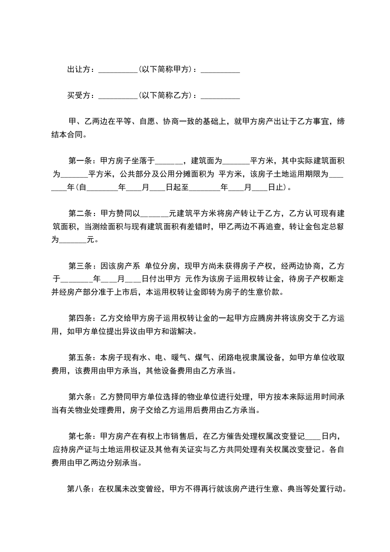 2、乙方自愿订购________小区________栋________号________室。 总建筑面积:________平方米。 单价:人民币________元/平方米,总价:人民币________元。大写____佰____拾____万____仟____佰____拾____元。