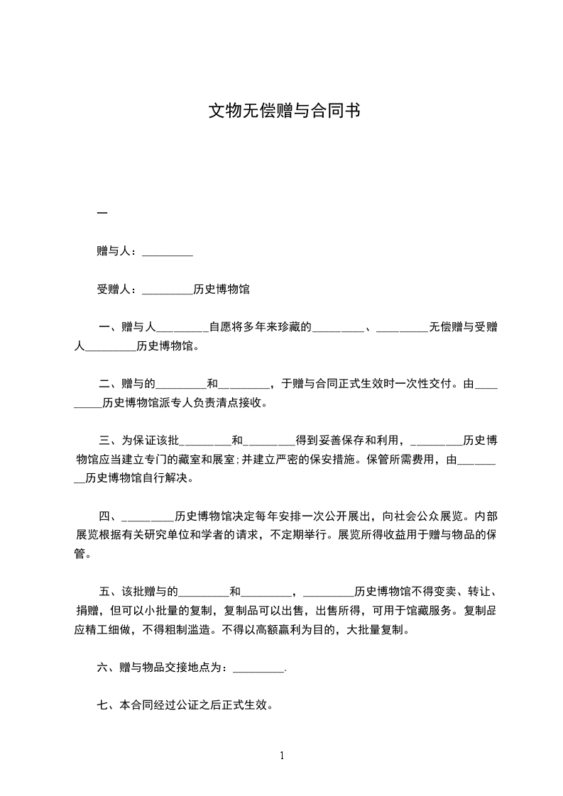 八、本合同有效期为_________年。在赠与人逝世后,由赠与人的法定继承人负责本合同的履行。在合同期满之后,可以由赠与人或其法定继承人与_________历史博物馆协商,确定有关事宜。