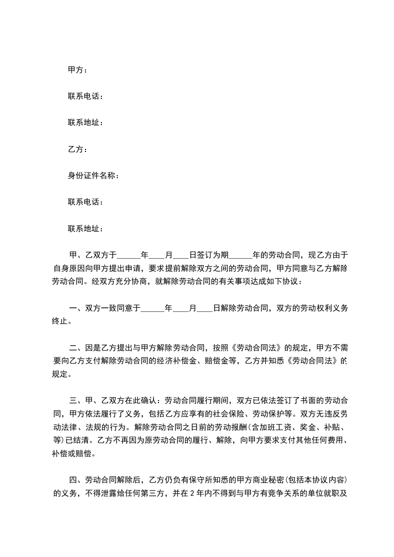 甲、乙双方于______年____月____日签订为期______年的劳动合同,现乙方由于自身原因向甲方提出申请,要求提前解除双方之间的劳动合同,甲方同意与乙方解除劳动合同。经双方充分协商,就解除劳动合同的有关事项达成如下协议: