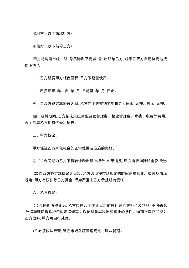 注:(1)合同期内乙方不得转让和出租此柜台,如果违反,甲方有权扣除租金及押金。