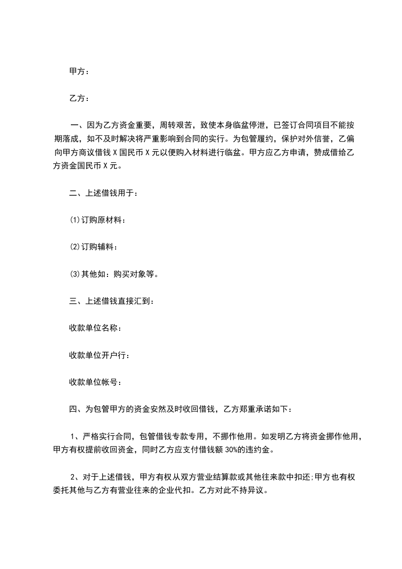 一、因为乙方资金重要,周转艰苦,致使本身临盆停泄,已签订合同项目不能按期落成,如不及时解决将严重影响到合同的实行。为包管履约,保护对外信誉,乙偏向甲方商议借钱X国民币X元以便购入材料进行临盆。甲方应乙方申请,赞成借给乙方资金国民币X元。