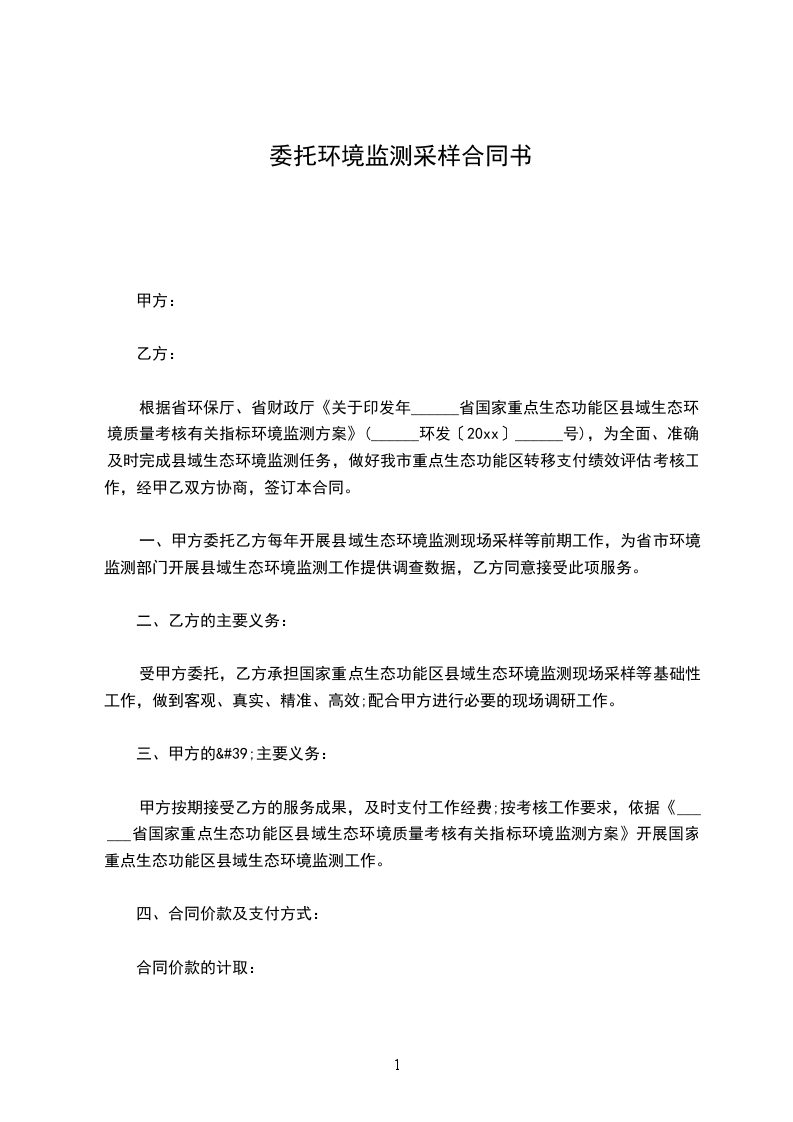 根据省环保厅、省财政厅《关于印发年______省国家重点生态功能区县域生态环境质量考核有关指标环境监测方案》(______环发〔20xx〕______号),为全面、准确、及时完成县域生态环境监测任务,做好我市重点生态功能区转移支付绩效评估考核工作,经甲乙双方协商,签订本合同。