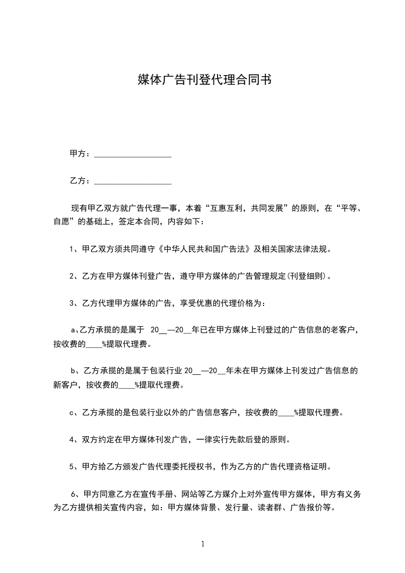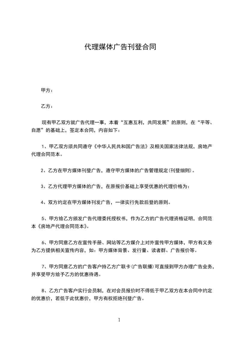 8、乙方广告客户实行会员制,在对会员报价时不得低于甲乙双方在本合同中约定的优惠价,若低于此优惠价,甲方有权拒绝刊登广告。