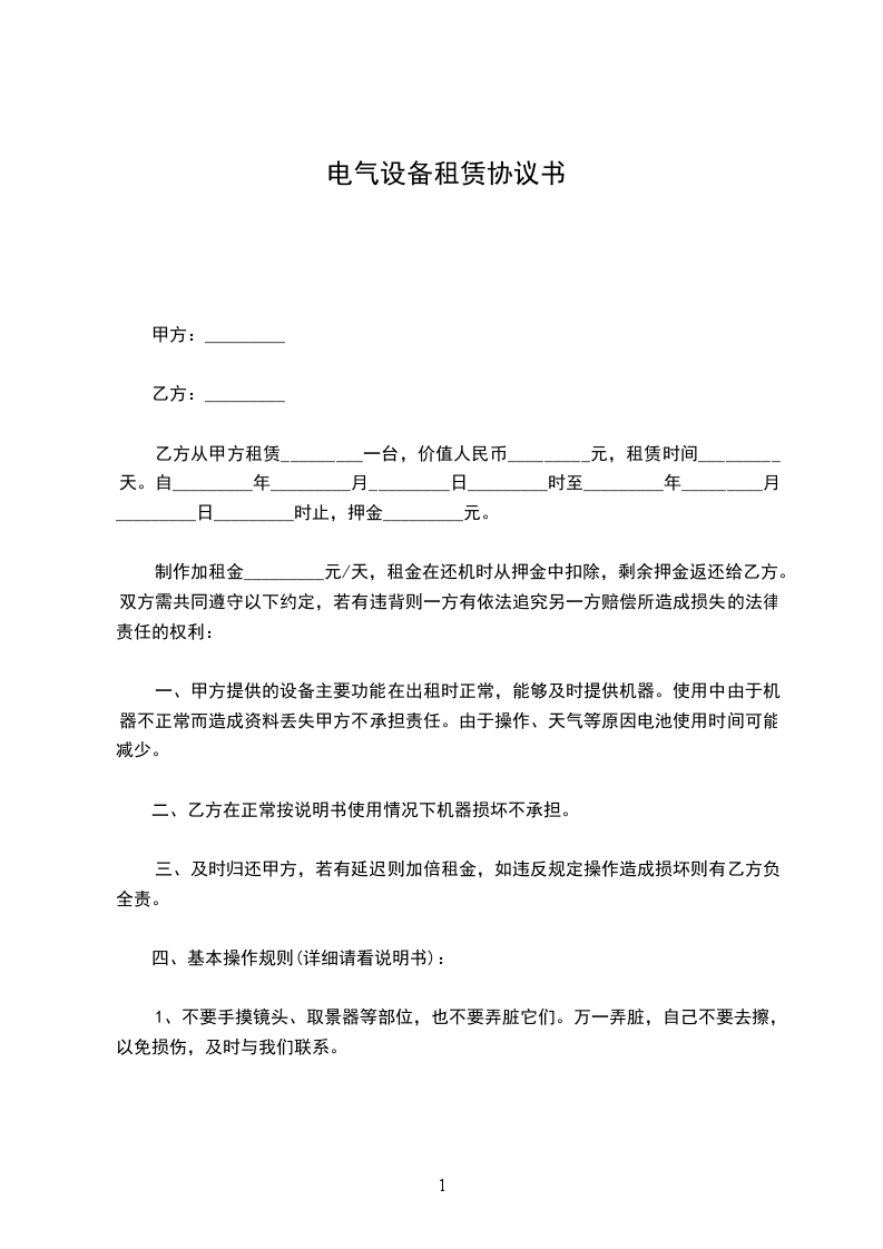 乙方从甲方租赁_________一台,价值人民币_________元,租赁时间_________天。自_________年_________月_________日_________时至_________年_________月_________日_________时止,押金_________元。