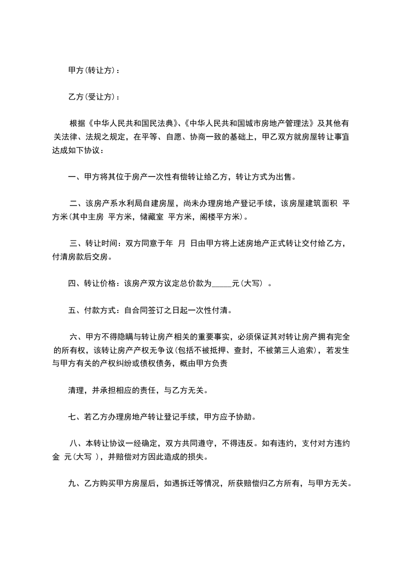 根据《中华人民共和国民法典》、《中华人民共和国城市房地产管理法》及其他有关法律、法规之规定,在平等、自愿、协商一致的基础上,甲乙双方就房屋转让事宜达成如下协议: