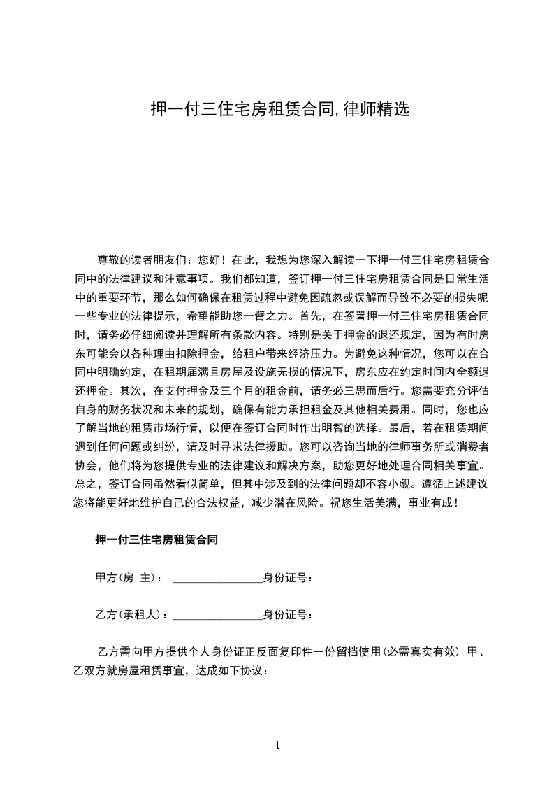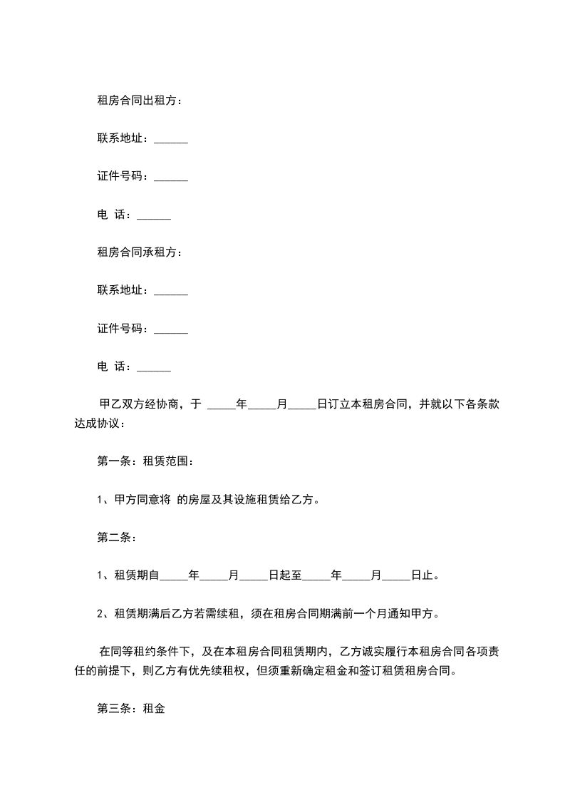 二、本房屋月租金为人民币_____元,押一付三。