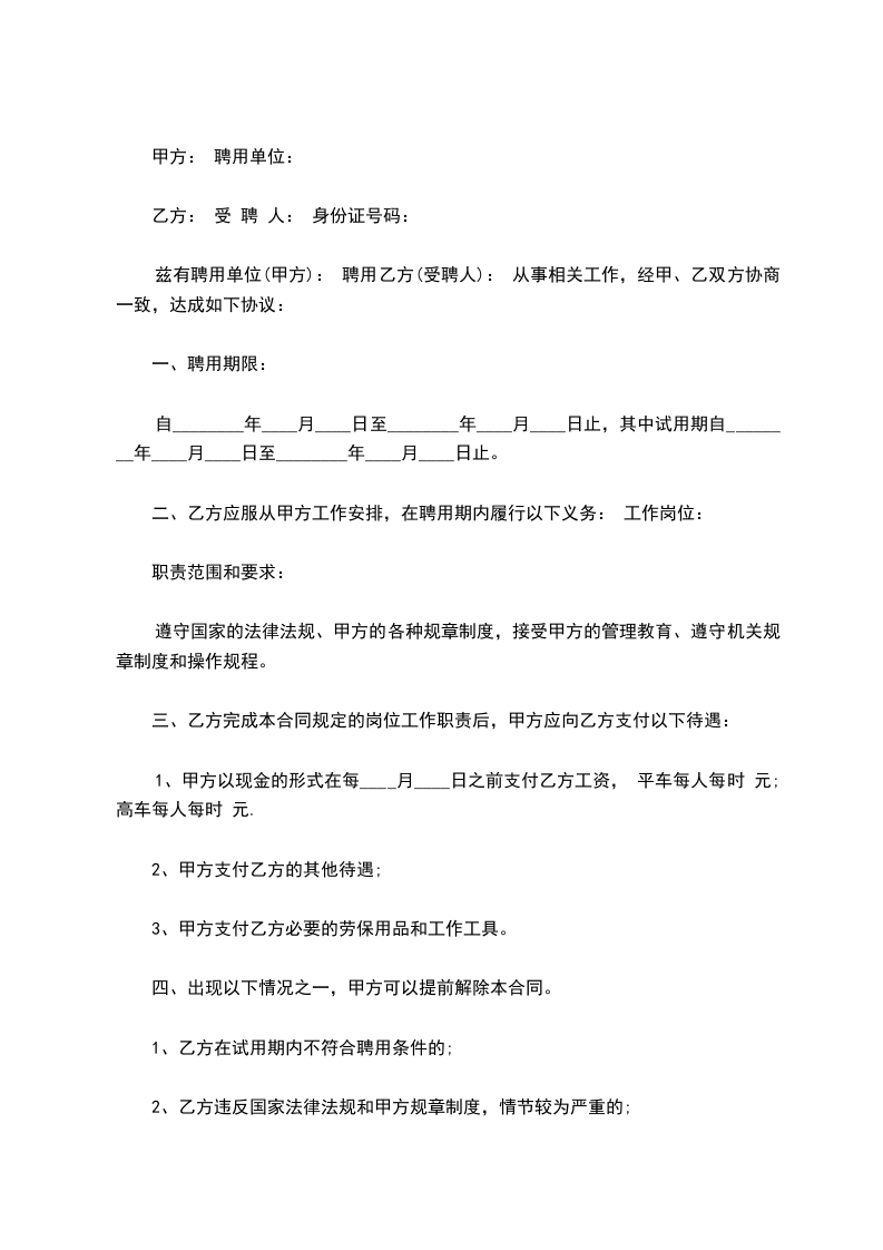 兹有聘用单位(甲方): 聘用乙方(受聘人): 从事相关工作,经甲、乙双方协商一致,达成如下协议: