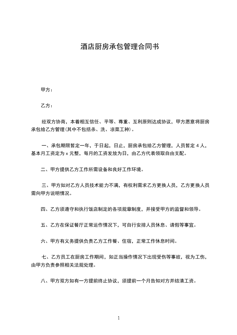 一、承包期限暂定一年,于日起,日止,厨房承包给乙方管理,人员暂定4人,基本月工资定为_____元整,每月的工资发放为日,由乙方代表领取自由支配。