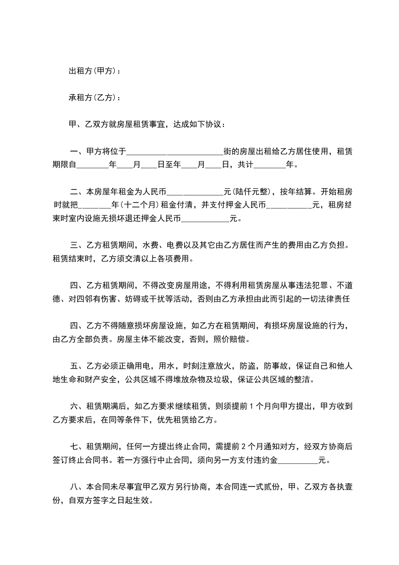 二、本房屋年租金为人民币______________元(陆仟元整),按年结算。开始租房时就把________年(十二个月)租金付清,并支付押金人民币___________元,租房结束时室内设施无损坏退还押金人民币____________元。