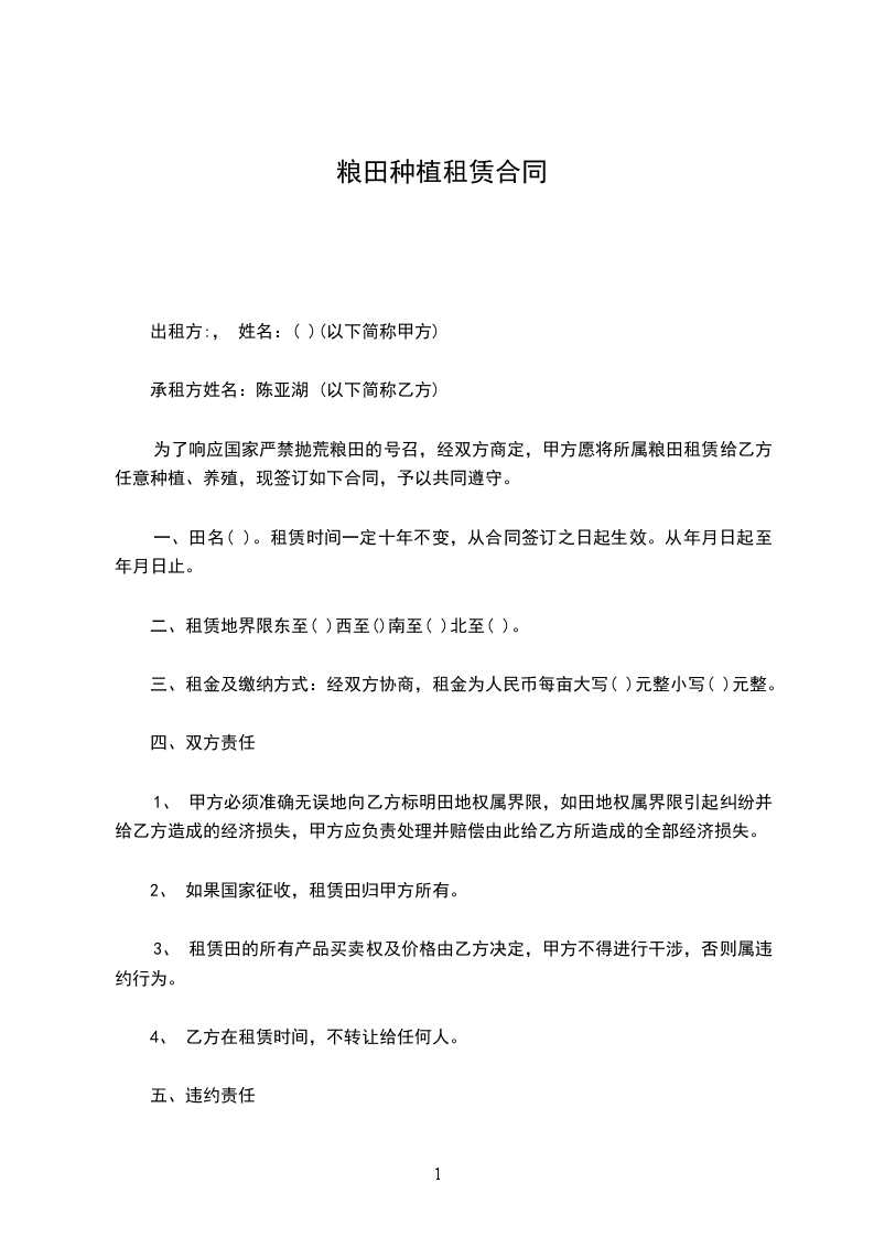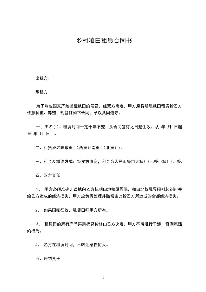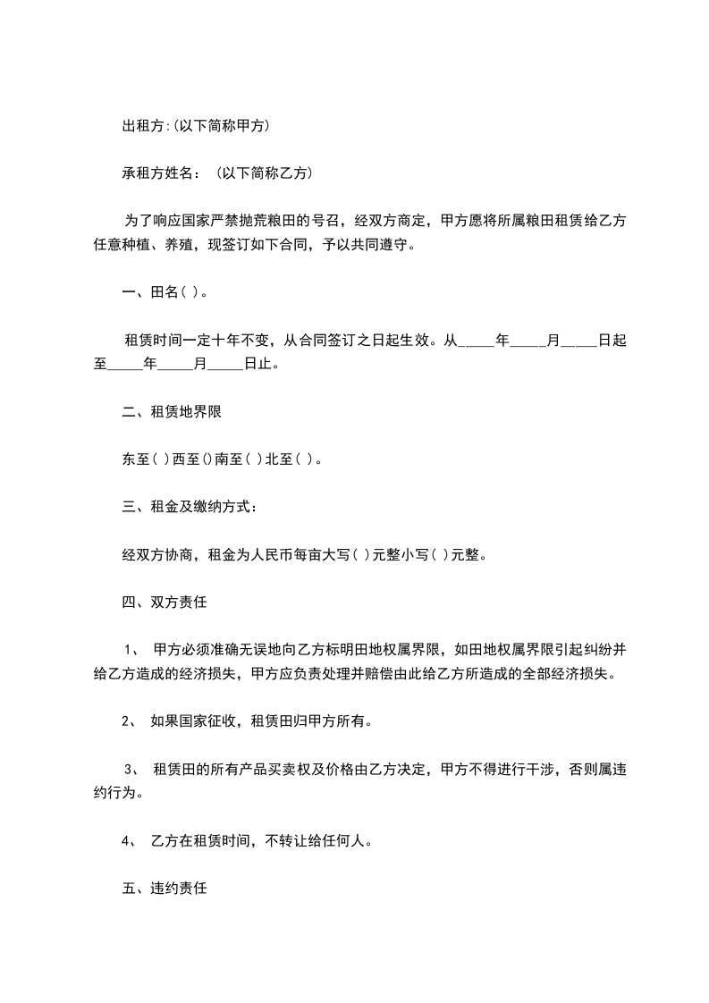 为了响应国家严禁抛荒粮田的号召,经双方商定,甲方愿将所属粮田租赁给乙方任意种植、养殖,现签订如下合同,予以共同遵守。