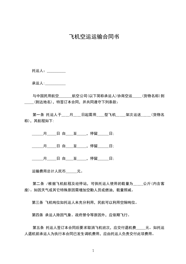 第五条 托运人签订本合同后要求取消飞机班次,应交付退机费_____元。如托运人退机前承运人为执行本合同已发生调机费用,应由托运人负责交付此项费用。