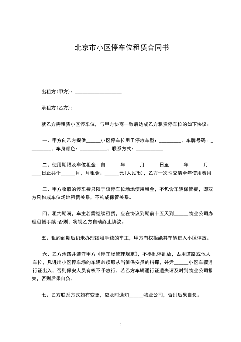 一、甲方向乙方提供______小区停车位用于停放车型:_________,车牌号码:_________,车身颜色:___________,联系方式:___________.