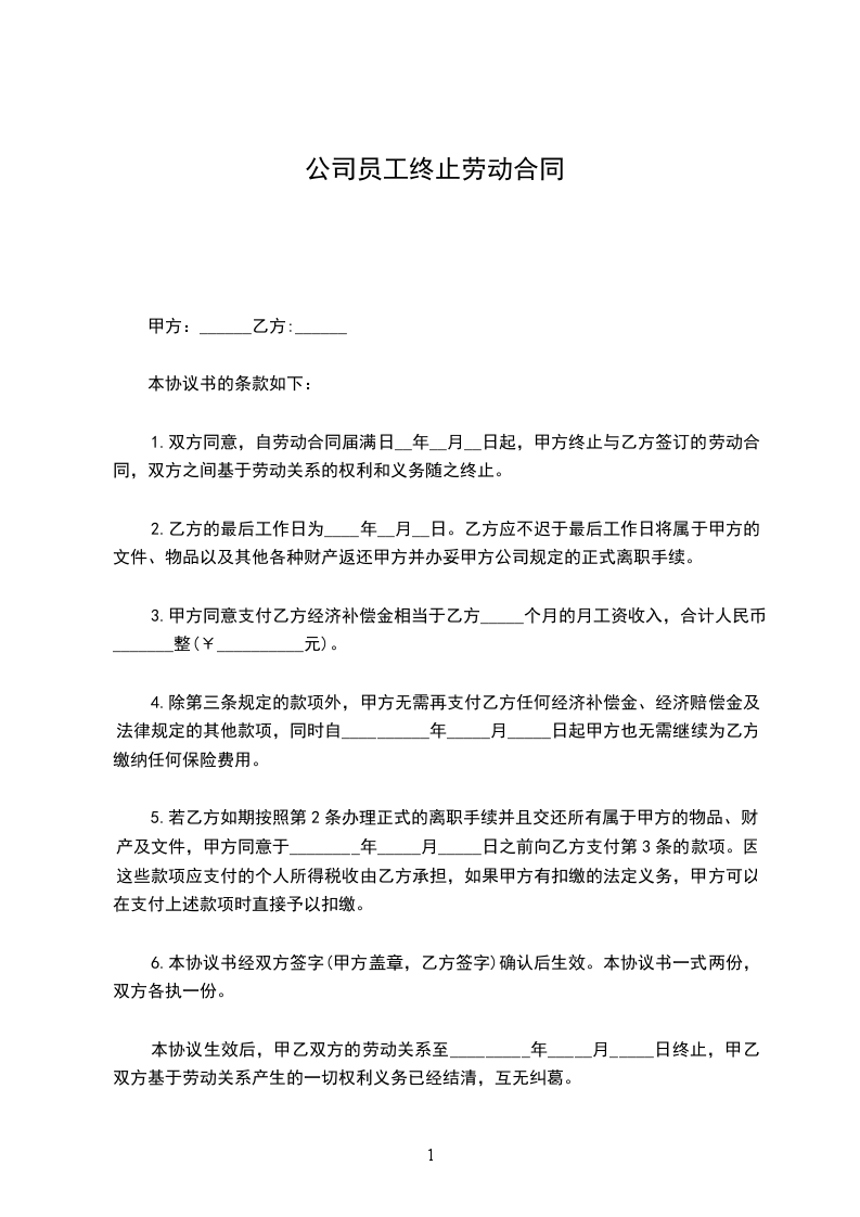 四、本协议生效之日起,甲乙双方因劳动关系所产生的权利和义务均完结。