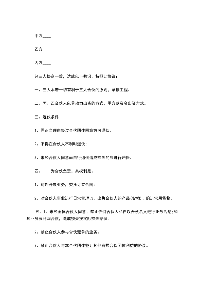 一、三人本着一切有利于三人合伙的原则,承接工程。