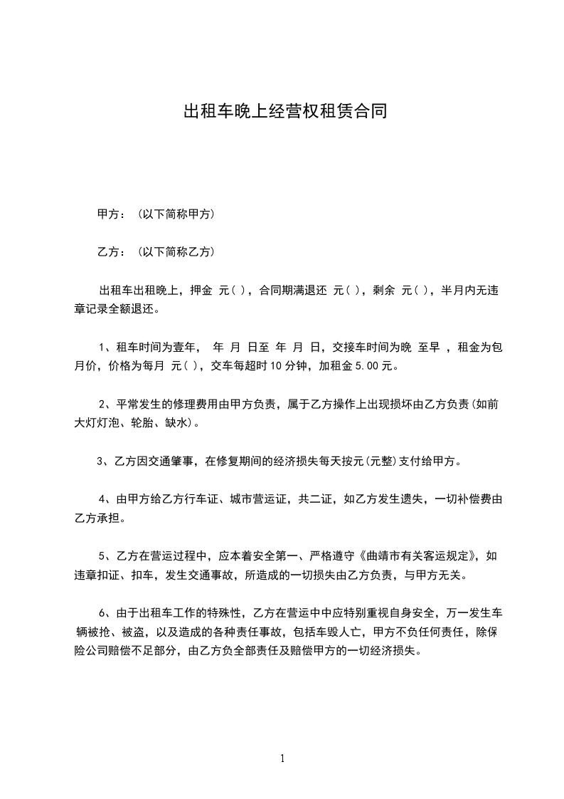 出租车出租晚上,押金 元( ),合同期满退还 元( ),剩余 元( ),半月内无违章记录全额退还。