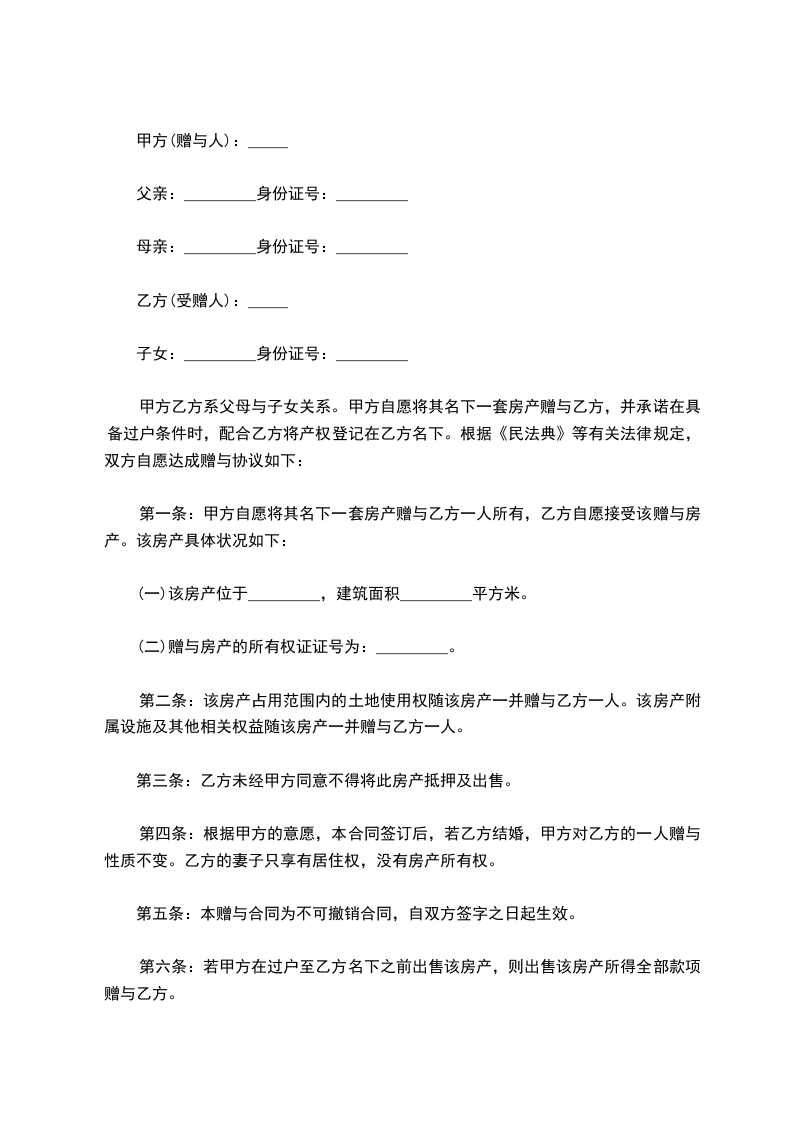 甲方乙方系父母与子女关系。甲方自愿将其名下一套房产赠与乙方,并承诺在具备过户条件时,配合乙方将产权登记在乙方名下。根据《民法典》等有关法律规定,双方自愿达成赠与协议如下: