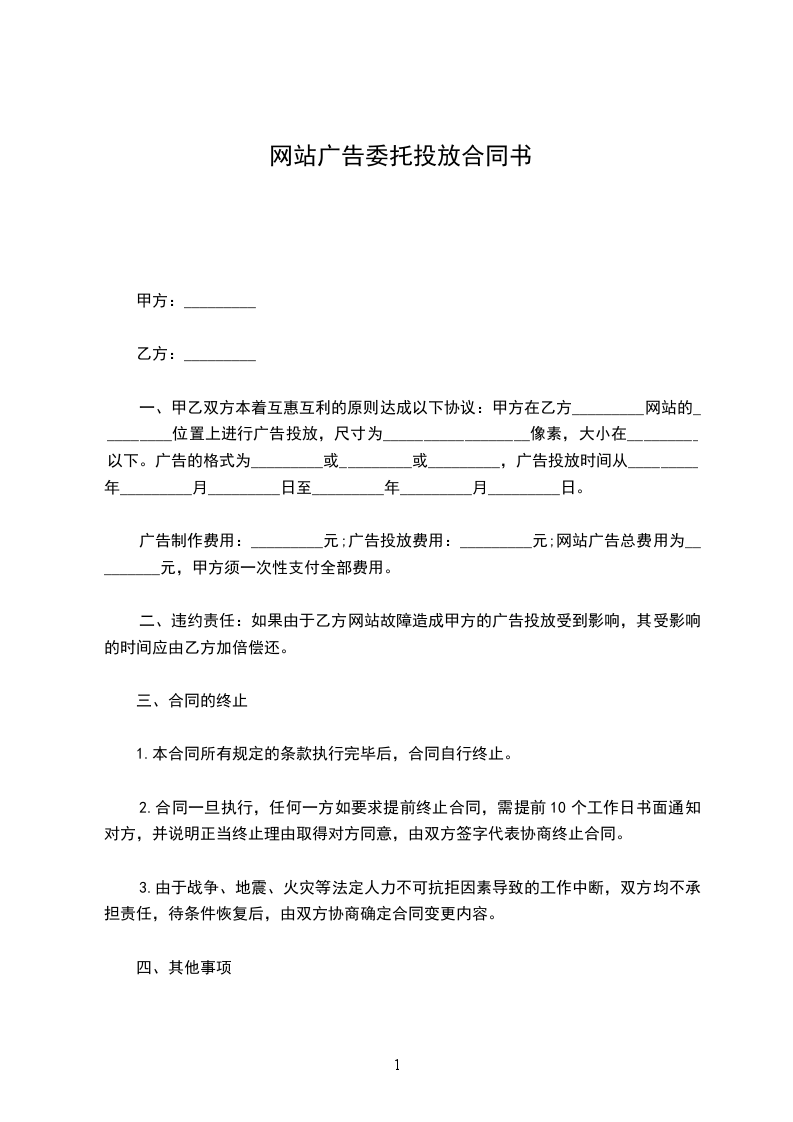 一、甲乙双方本着互惠互利的原则达成以下协议:甲方在乙方_________网站的_________位置上进行广告投放,尺寸为__________________像素,大小在_________以下。广告的格式为_________或_________或_________,广告投放时间从_________年_________月_________日至_________年_________月_________日。