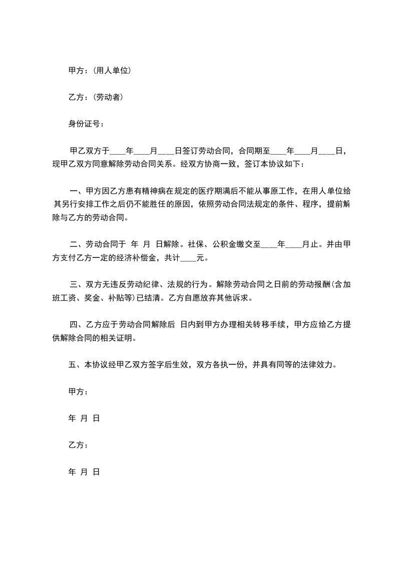 乙方于 年 月 日入职甲方,任___________。现乙方因患病需回家休养治病向甲方申请解除劳动关系,并给予补偿。考虑到乙方的实际困难及意愿,甲方同意解除劳动关系并给予相应补偿。经双方平等协商,并根据相关法律规定,就有关合同解除及离职手续等问题达成如下一致协议: