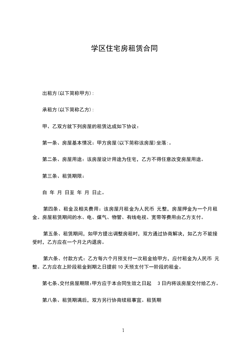 第四条、租金及相关费用:该房屋月租金为人民币 元整,房屋押金为一个月租金。房屋租赁期间的水、电、煤气、物管、有线电视、宽带等费用由乙方支付。
