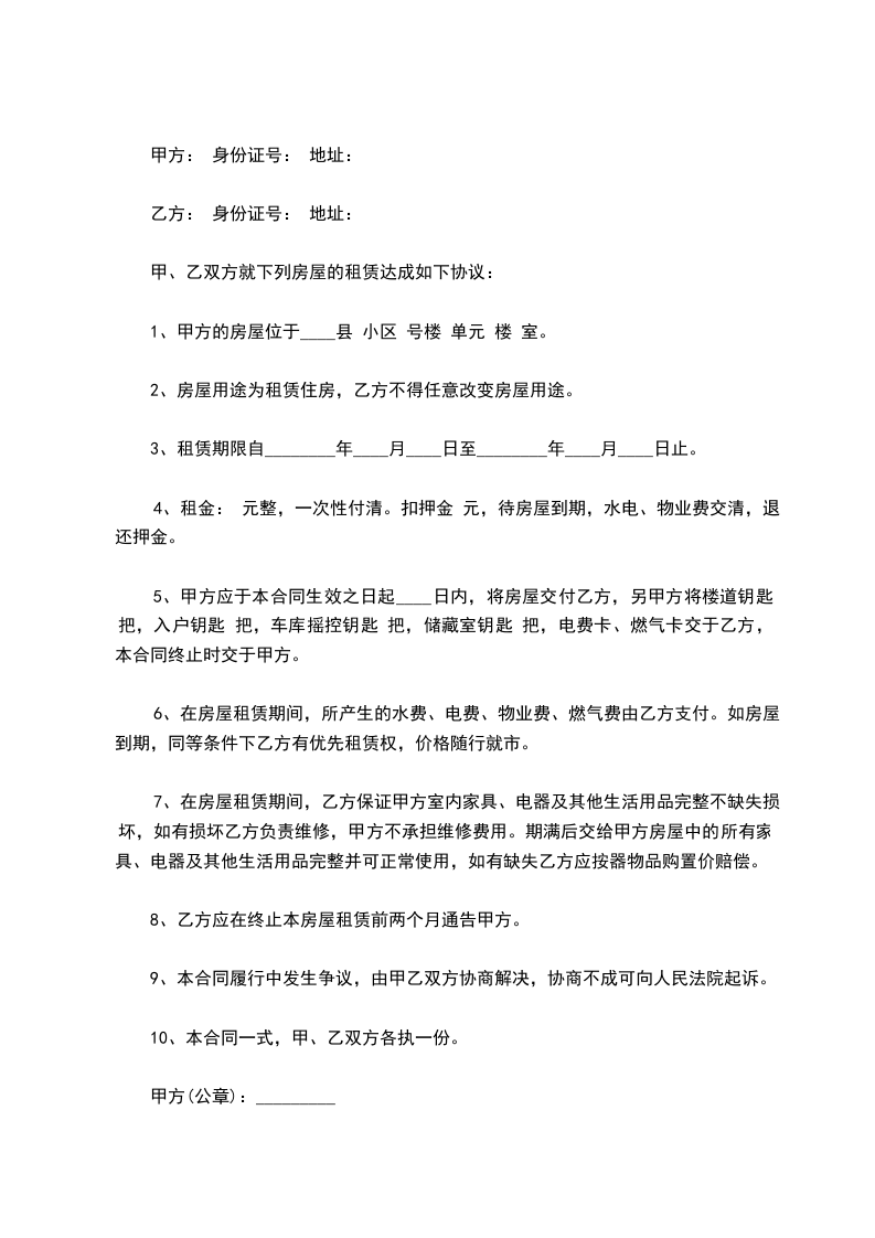4、租金: 元整,一次性付清。扣押金 元,待房屋到期,水电、物业费交清,退还押金。