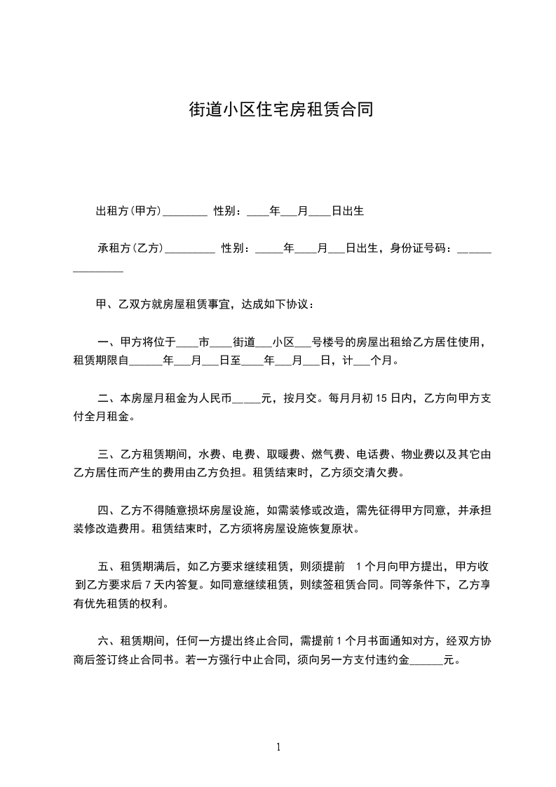 一、甲方将位于____市____街道___小区___号楼号的房屋出租给乙方居住使用,租赁期限自______年___月___日至____年___月___日,计___个月。