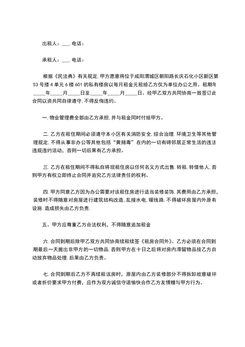 二、甲、乙协定出租物业,月租金为________________元(人民币),付款方式为________________,起租日为________________年________________月________________日。定金有效期为此协议签定之日起________________天内有效。