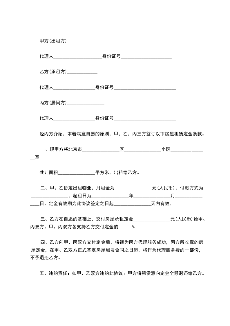 经丙方介绍,本着满意自愿的原则,甲,乙,丙三方签订以下房屋租赁定金条款。