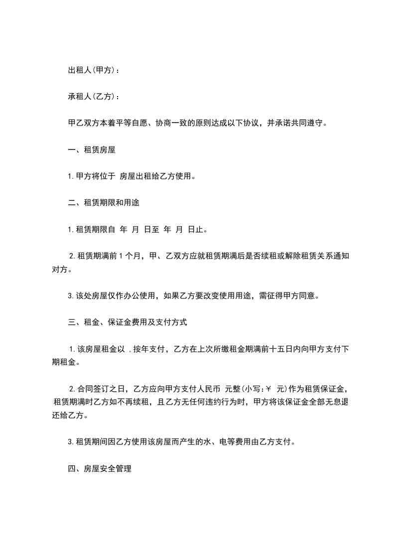 2、本房屋月租金为人民币 元,按月/季度/年结算。每月月初/每季季初/每年年初 日内,乙方向甲方支付全月/季/年租金。