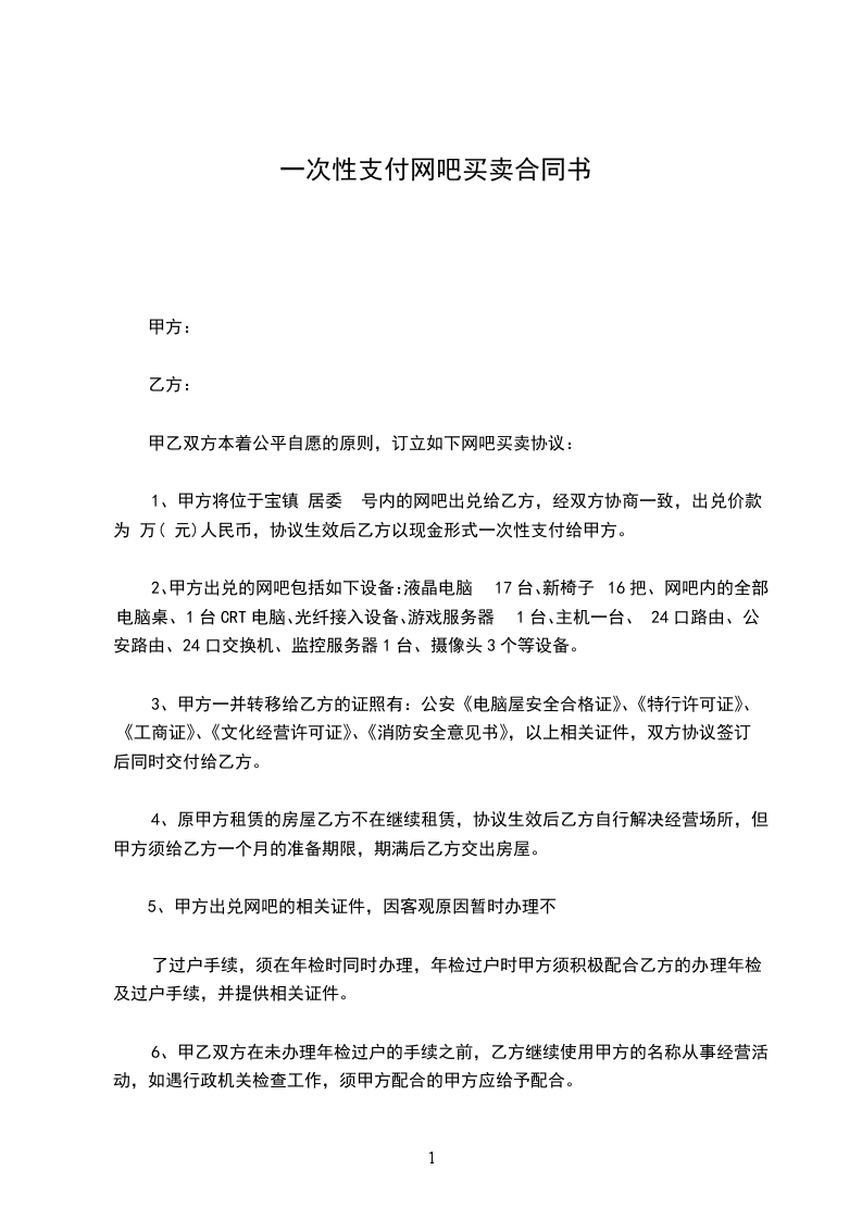 1、甲方将位于宝镇 居委 号内的网吧出兑给乙方,经双方协商一致,出兑价款为 万( 元)人民币,协议生效后乙方以现金形式一次性支付给甲方。