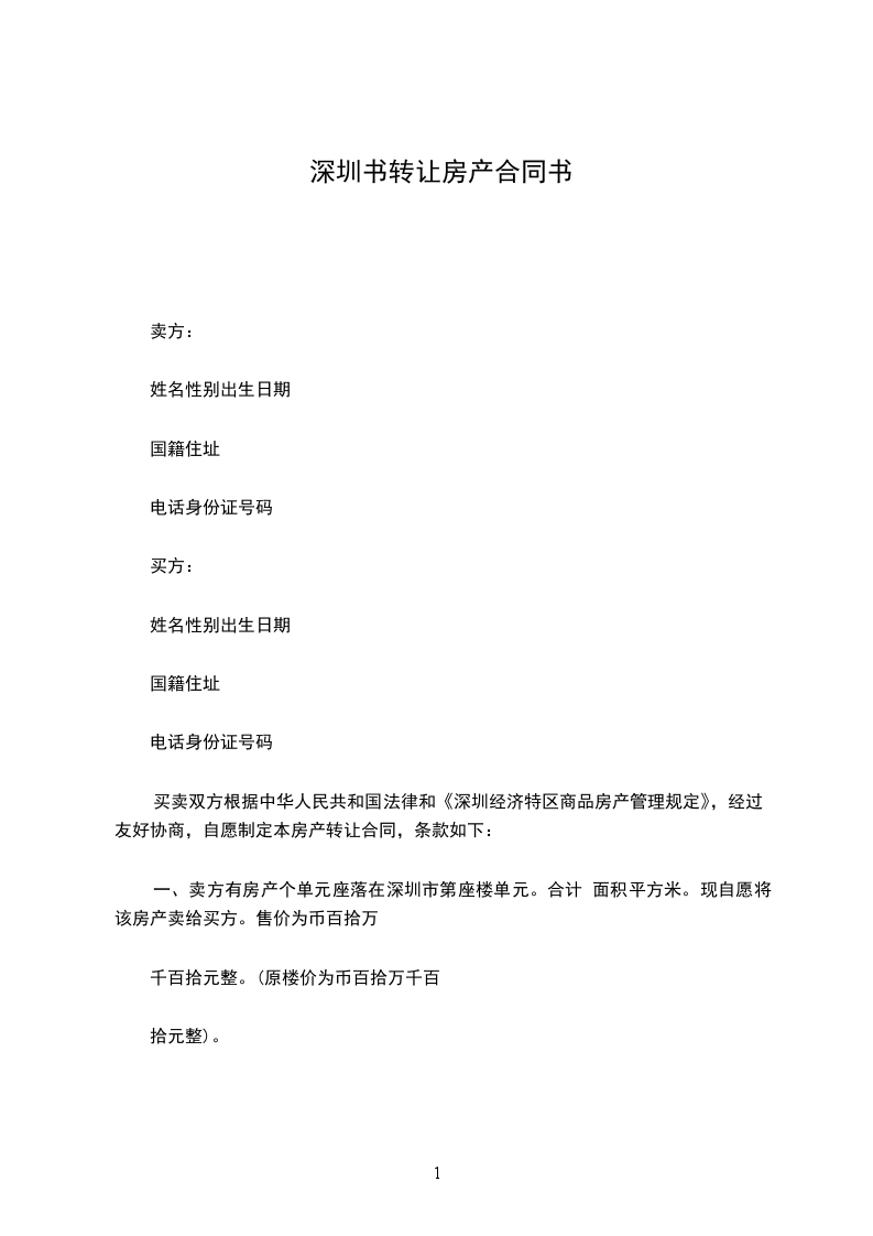一、卖方有房产个单元座落在深圳市第座楼单元。合计 面积平方米。现自愿将该房产卖给买方。售价为币百拾万