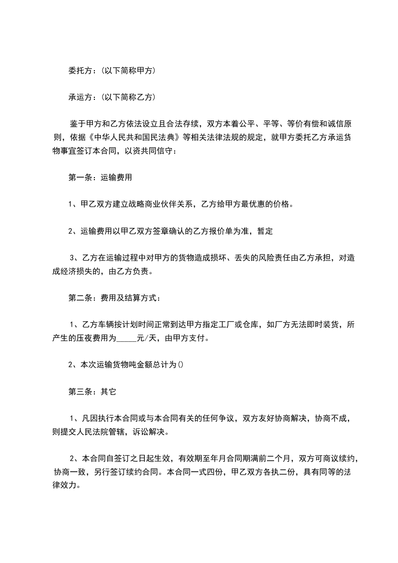 1、乙方车辆按计划时间正常到达甲方指定工厂或仓库,如厂方无法即时装货,所产生的压夜费用为_____元/天,由甲方支付。